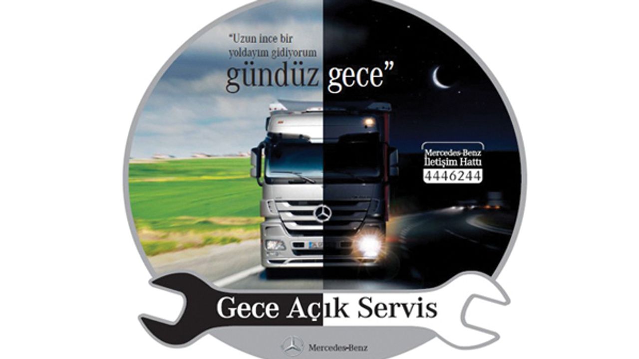 Araçlarının devamlı çalışır halde olmasını tercih eden, çalışma saatleri içerisinde araçlarını bakım ya da onarım için servise teslim ederek zaman kaybetmek istemeyen kamyon ve otobüs müşterilerinin taleplerini göz önünde bulunduran Mercedes-Benz Türk, müşterilerinin bu ekonomik kaygılarına cevap vermek amacıyla bu yıl “Gece Ek Servisi” çalışmasını başlattı. Bu çalışma kapsamında Mercedes-Benz Türk yetkili servisinden önceden alınan randevu ile müşteriler, araçlarını akşam saatlerinde servise bırakarak sabah teslim alabiliyorlar. Küçük onarım ve bakım çalışmaları için araçlar 18:00’de servise bırakılarak 00:00’da ya da ertesi günün sabahı teslim alınabiliyor.