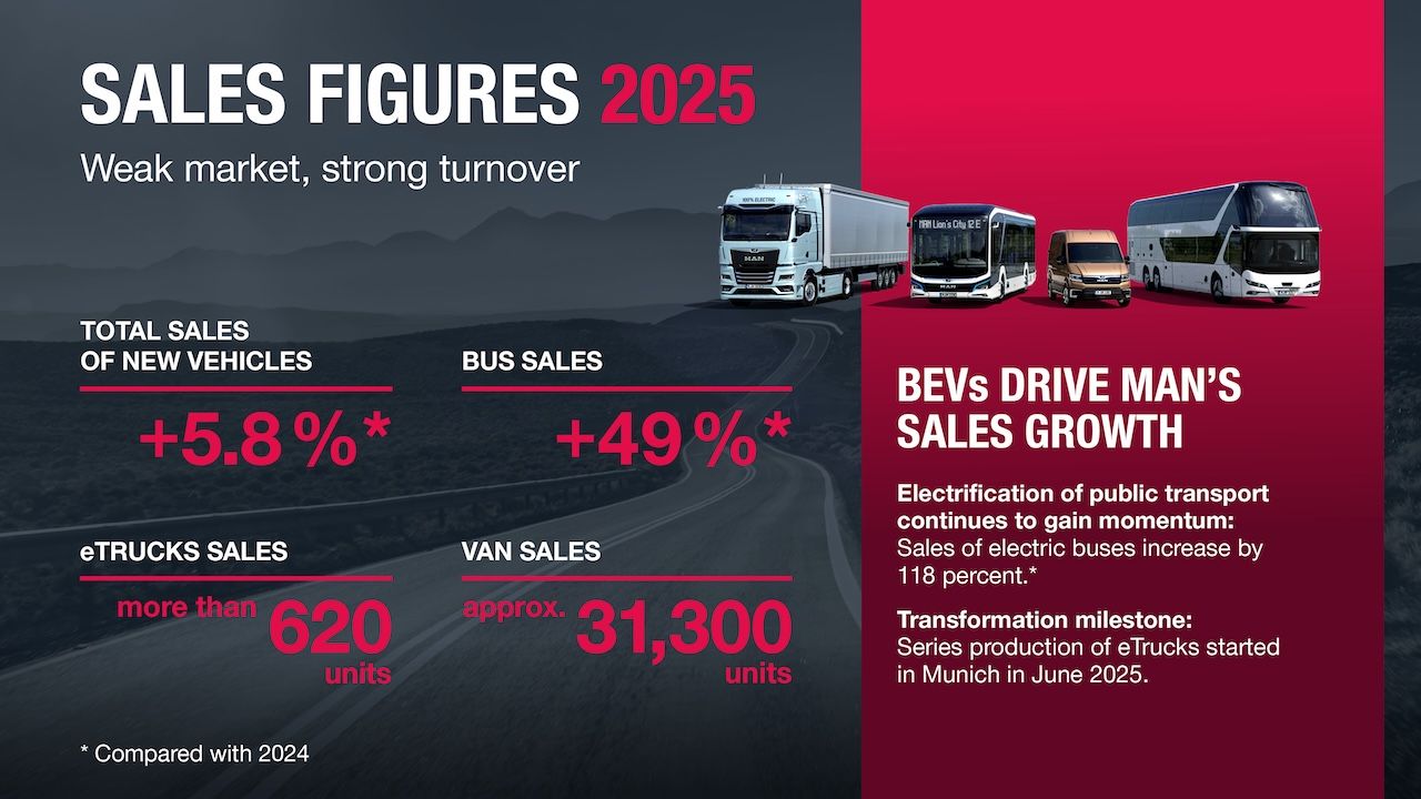 MAN'ın otobüs faaliyetleri 2025 yılında önemli bir toparlanma göstererek, yaklaşık %49’luk artışla 7.000 adedi aştı. Bataryalı şehir içi otobüsler, bu segmentteki satışları artıran en önemli faktör oldu. Şehir içi elektrikli otobüs satışları %118'in üzerinde artışla 1.300 adedin üzerine çıkarak yeni bir rekor kırdı. Bu rakam, 2026’nın sonunda Avrupa pazarındaki ilk müşterilere teslim edilmesi planlanan MAN Lion's Coach E’yi kapsamıyor.